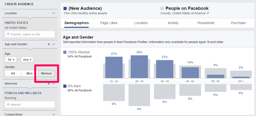 3. The initial search gives us some pretty broad options that probably aren’t that useful. However, they do indicate that of those interested in running, 60% of them are women, so let’s narrow by gender for our first audience persona. Remember, we will end up creating multiple personas for our brand — this is just one demographic we are targeting.