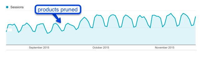 We kept all of these products in the catalog so as not to lose any selection from a user-experience perspective. Just because a product page doesn’t rank well, doesn’t have any referral or search traffic, and doesn’t have any links does not mean it won’t sell.