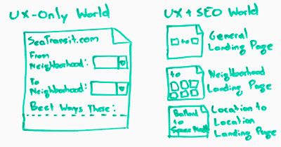 But what has happened is that you've forgotten about UX+SEO world. I'll give you an example here. Let's say I'm trying to make a website all about transportation in the Seattle area. I want to provide people with how to get to and from places, and the best times to go, and are you thinking about traffic, and are you thinking about comparing public versus private transport options, and driving versus Lyft versus Uber versus renting a car, all these different kinds of things. I'm covering the whole world of Seattle transit.