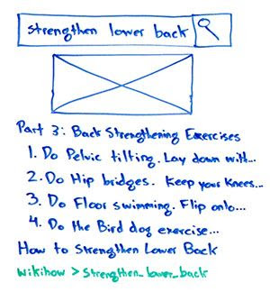 Lists look like this. So I search for "strengthen lower back," I get, again, that image and then I get — this is from wikiHow, so quality, questionable — but back strengthening exercises. They say, number one, do pelvic tilting. Number two, do hip bridges. Number three, do floor swimming. Number four, do the bird dog exercise. That sounds exciting and painful. This is from an article called "How to Strengthen Lower Back," and it's on wikiHow's URL there. These lists, that are usually in numeric or they can be in bullet point format, so either one can appear, they're about 19% of answers.