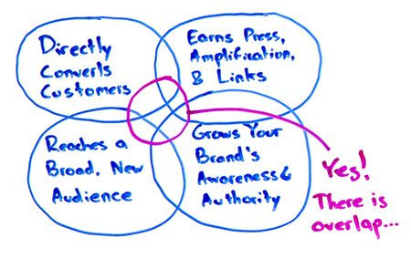 Now, there's overlap between them. I haven't perfectly illustrated this with a great Venn diagram. But in here there is lots of overlap between these different goals. You could have a piece of content that is both designed to earn press and amplification and links and is reaching a broad new audience. Or you might have some content that is directly converting customers that maybe also has some link amplification sorts of overlap. It's pretty tough to overlap anything else with directly converting customers, but the other three definitely easier to do overlap.