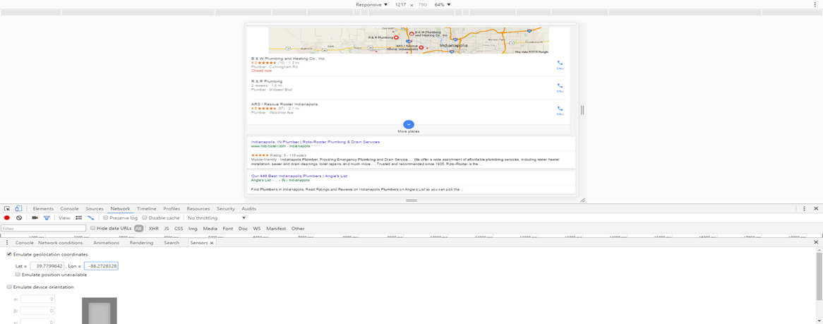 You can also use DevTools’ GeoLocation Emulator to get view the web as though you are in a different location. For those of you who have fond memories of the nearEquals query parameter, this is another way you can get a sense of where you rank in precise locations.