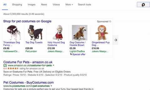 Not finding your site on the first page? Instead of clicking through to the many ooooos of Google, we’re going to change the settings in your browser to show 50 or 100 results per search so we can view more results with every search. I’m going to want to see A LOT more pet costume results, so I’ll click on the gear icon in Chrome and hit "Search Settings," then toggle up the "Results per page":