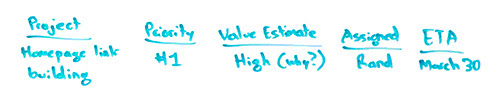 You can also think about adding some additional things to your content-to-keyword map or to your project list by breaking down all the SEO efforts that you're going to do to hit all these goals into discrete projects with a few thingsan estimated time of delivery, the people who are assigned to it, and an ordering based on the expected return on investment. You can be wrong about this. It's okay to be, "Hey, we're taking our best guess, thumb in the air. We don't really know for sure, but we're going to try. Here's the project. It's link building for the home page. It's our number-one priority. The value estimate is high because we currently rank number two or three for our own brand name. It's assigned to this person, to Rand, and the ETA is March 30th." Great, terrific, and now I know. I've taken this from here and from my projects list. It's part of my goals. It's where I think I can have a big impact. Terrific.