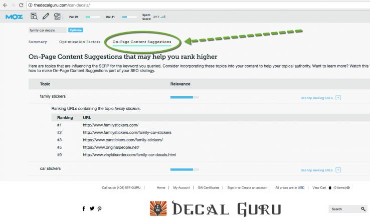For this family decal segment, there are dozens of different individual product pages, so the goal is to make sure we optimize not just for a broad term like “car decal” but for a more nuanced term like “family car decal.” And then for the products themselves, dig into modifying terms relevant to the features.