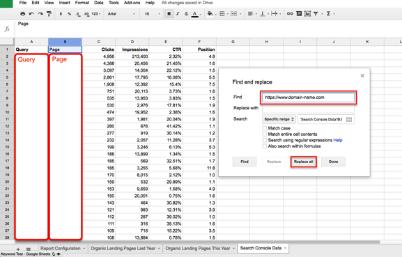 First, we just need to strip the domain name from the Search Console data. You’ll notice the data from Google Analytics pulls the top landing pages excluding the https://domain-name.com, and Search Console pulls the entire domain.Therefore, we have to format them identically in order to combine the data. To do this, you’ll need to execute a "find and replace" on your Page column in the Search Console tab in Google Sheets and replace https://domain-name.com with no replacement (eliminating the domain name from the URL).
