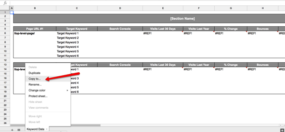 After you copy the sheet over, you should see a new sheet with a tab called Keyword Data. From here, select the Keyword Data tab and click Copy to...