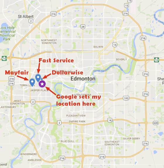 These business are all so close to me that I could walk to them in about 8 to 15 minutes. Here’s a map of Edmonton with pins for my location and these 3 businesses. Just look at how close they are to my location: