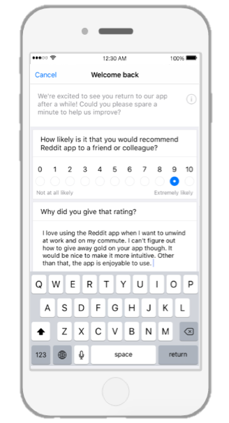This means that even if you haven’t seen web-survey success, if done correctly, you can expect a higher volume and higher-quality feedback from your mobile audience. In a survey we conducted in conjunction with SurveyMonkey, we found 51% of consumers expect companies to ask them for feedback directly, whether it be in the app, on the phone, or in-store. Moreover, 98% of consumers who prefer to leave feedback in the app are likely to do so when asked for it directly.