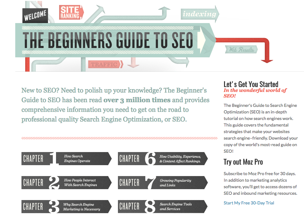Moz’s Beginner’s Guide to SEO is a master class in how comprehensive beginner-level content becomes a link magnet. Not only does the guide have backlinks from more than 1,700 RDs, it also edges out the home page as the most-trafficked page on the site, according to SEMrush.