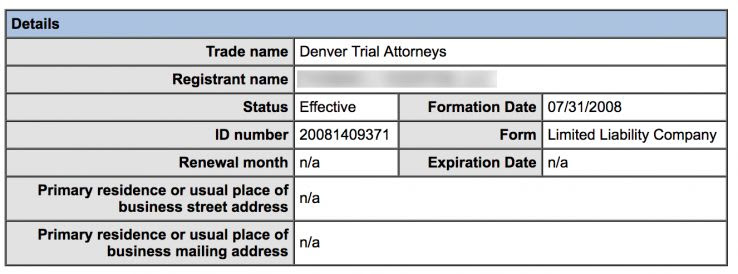I checked out the Colorado Secretary of State’s website and did a little digging around. After a few minutes I found the legally registered trade name through their online search portal. The formation date of this entity was 7/31/2008, so they appear to have been planning on using the name for some time.