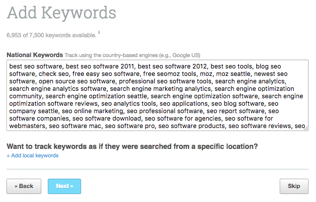 I’ve got my Campaign pulled up, so I’m going to add some keywords and track them nationally and locally.