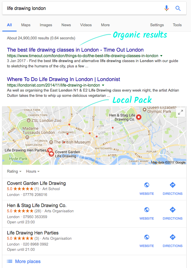 And likewise, you may expect a search for “life drawing london” to show only local results, but lookie here: we’ve also got some top organic results that have targeted “life drawing london” and the local results creep ever closer to the top: