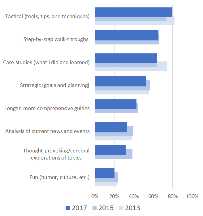 This is a great echo and validation of what we took away from the more general question about what you'd like to see different about the Blog: More tactical posts and step-by-step walkthroughs. Posts that cut to the chase and offer a clear direction forward, as opposed to some of the types at the bottom of this list, which offer more opinions and cerebral explorations:
